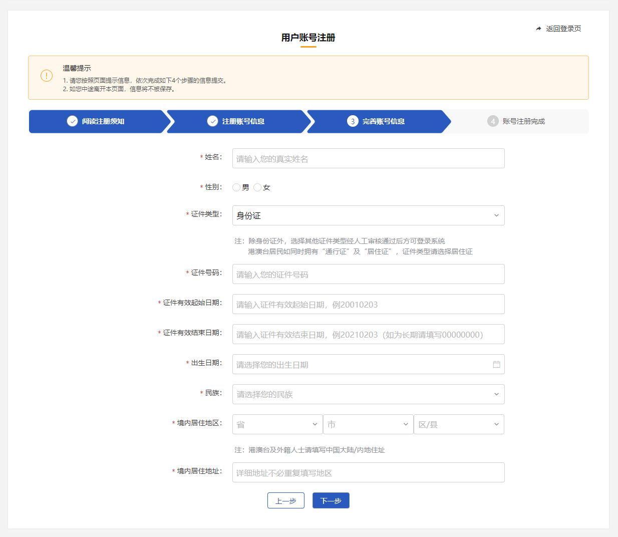 ▼ 完善账号信号,包含:姓名、性别、证件类型、证件号码、证件有效起始时间&结束时间、出生日期、民族、境内居住地区、境内居住地址,填写完成后点击 [下一步] 按钮。