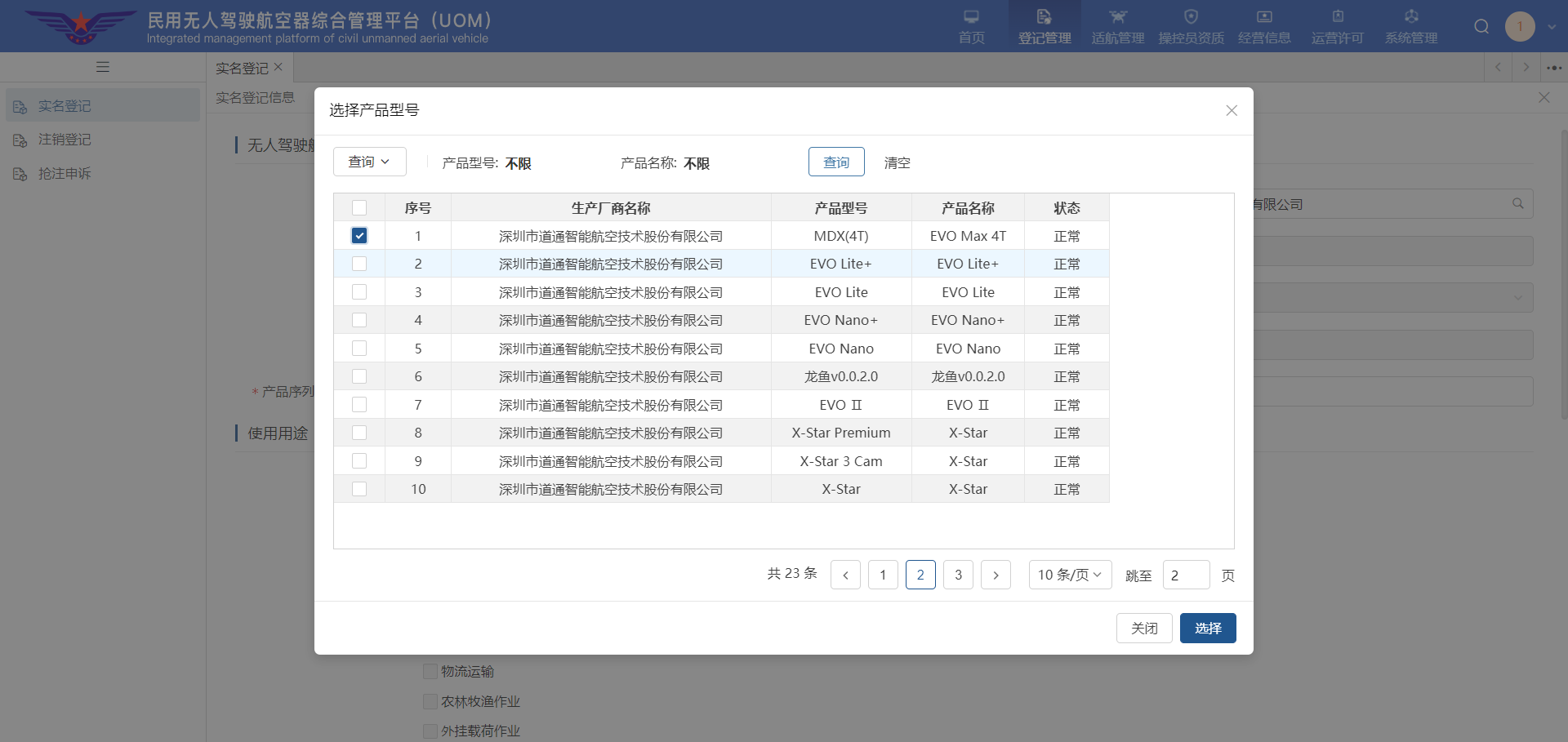 ▼ 以道通智能产品为例,在弹出的生产厂商列表中,点击左上角 [查询] 按钮,在 [生产厂商名称] 输入框中输入关键词“道通智能”。