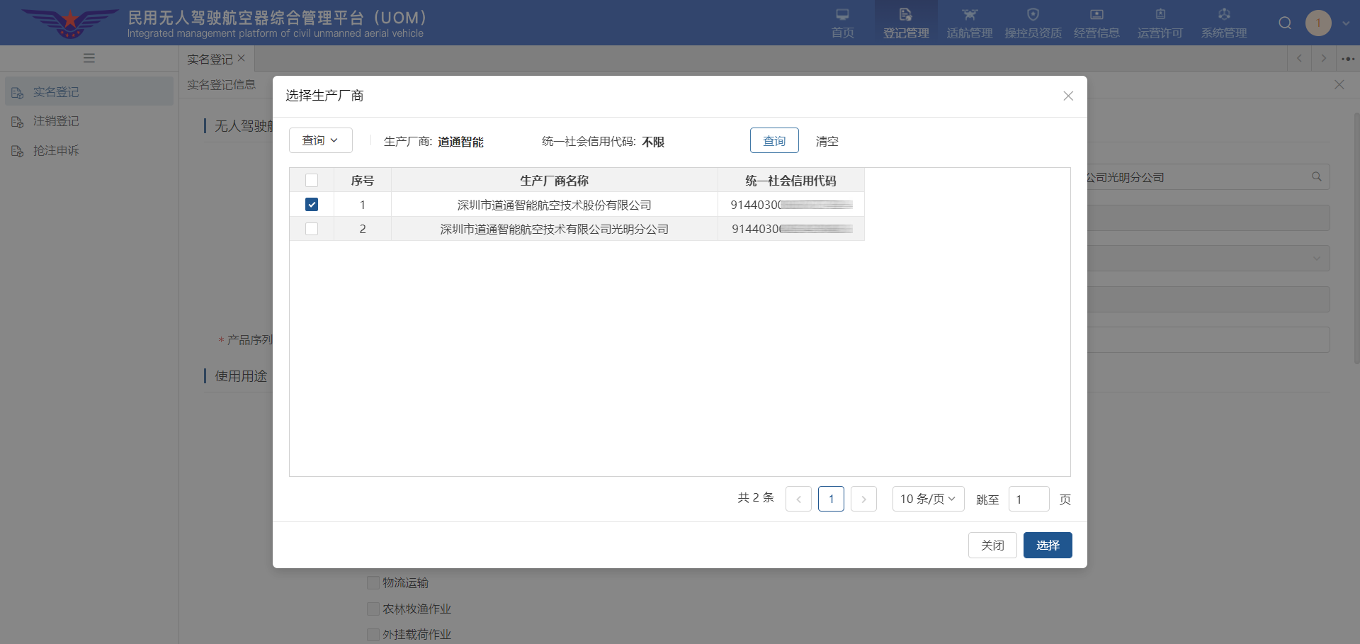 ▼ 点击蓝色 [查询] 按钮,在搜索结果中,勾选序号1对应的名称“深圳市道通智能航空技术股份有限公司”,点击右下角蓝色 [选择] 按钮。
