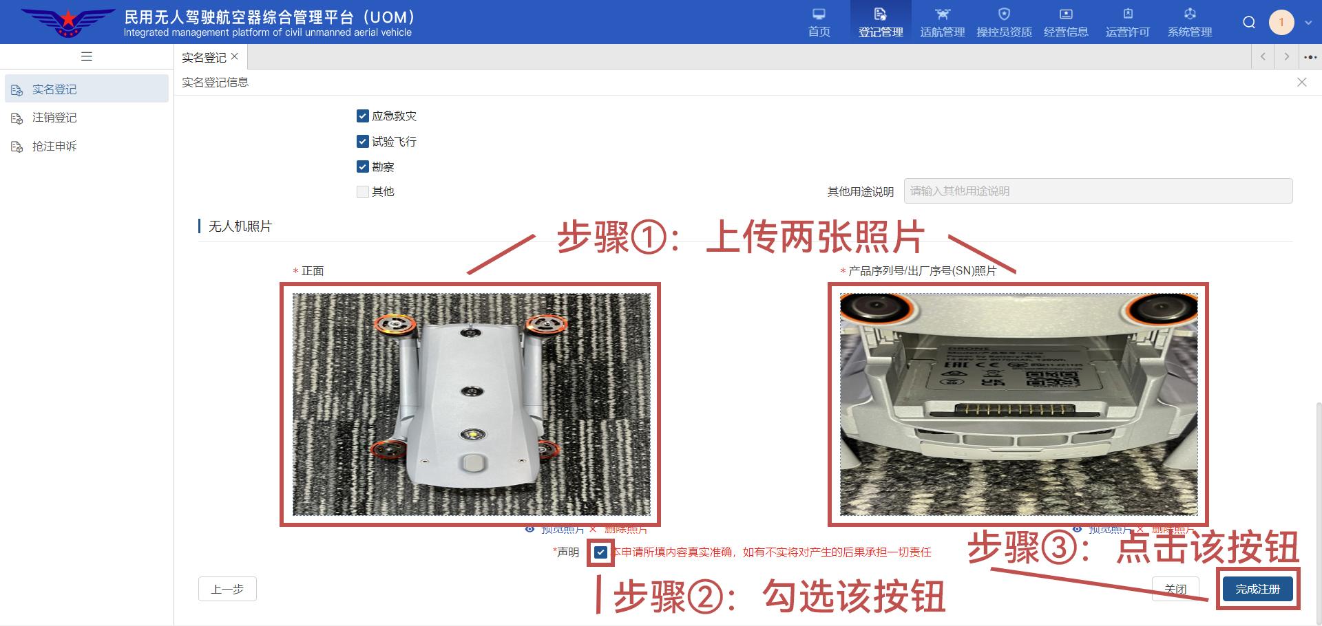 ▼ 最后,根据要求拍摄并上传 [正面] 、[产品序列号/出厂序号(SN)照片] 两张无人机照片。勾选 [声明 - 内容真实准确] 按钮,点击右下角蓝色 [完成注册] 按钮,即可完成实名注册登记流程。