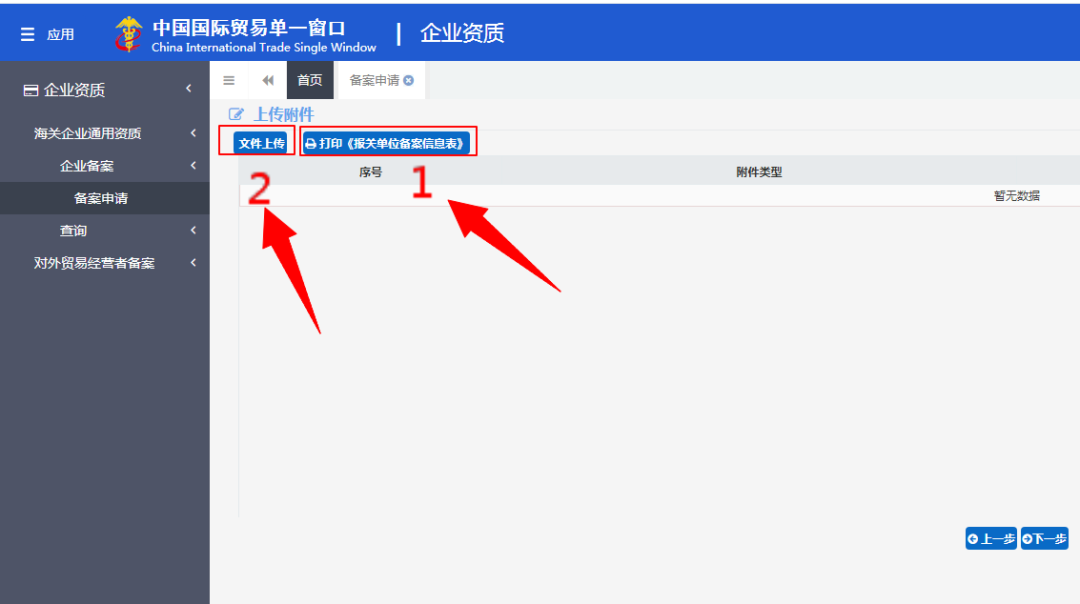 ⑦ 信息填写完毕后,先打印《报关单位备案信息表》,再通过“文件上传”上传加盖单位公章的《报关单位备案信息表》。