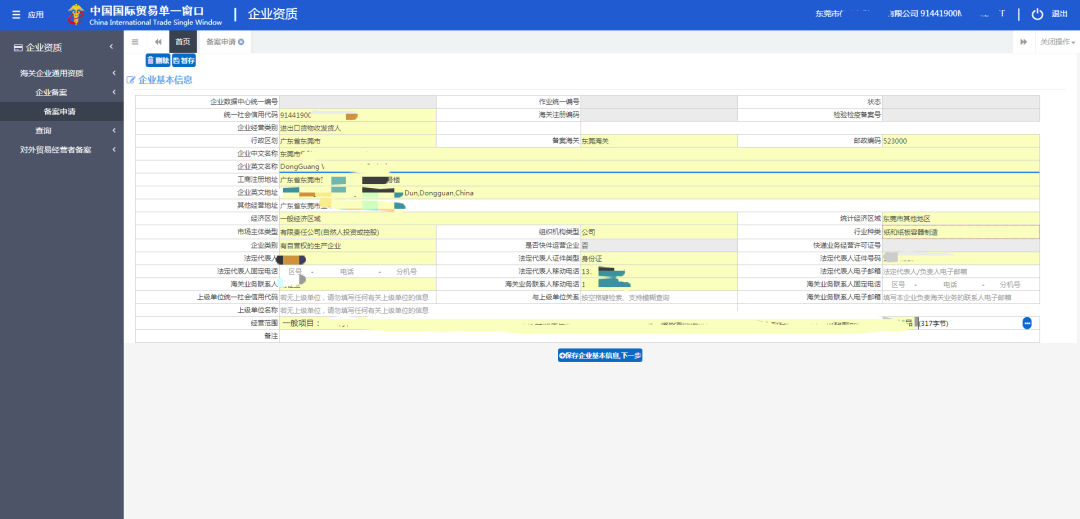 ⑥ 保存企业基本信息后,点击“下一步”,依次增加“投资者信息”“报关人员信息”。