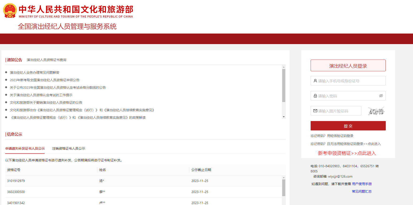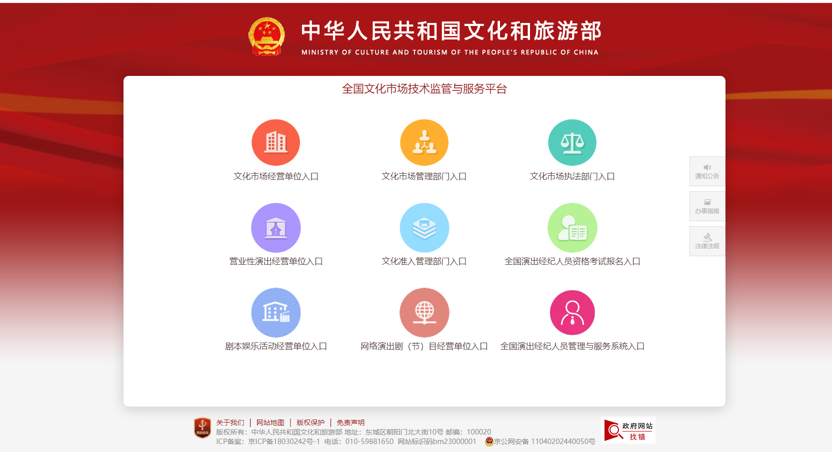 1、进入全国文化市场技术监管与服务平台,选择全国演出经纪人员管理与服务系统入口