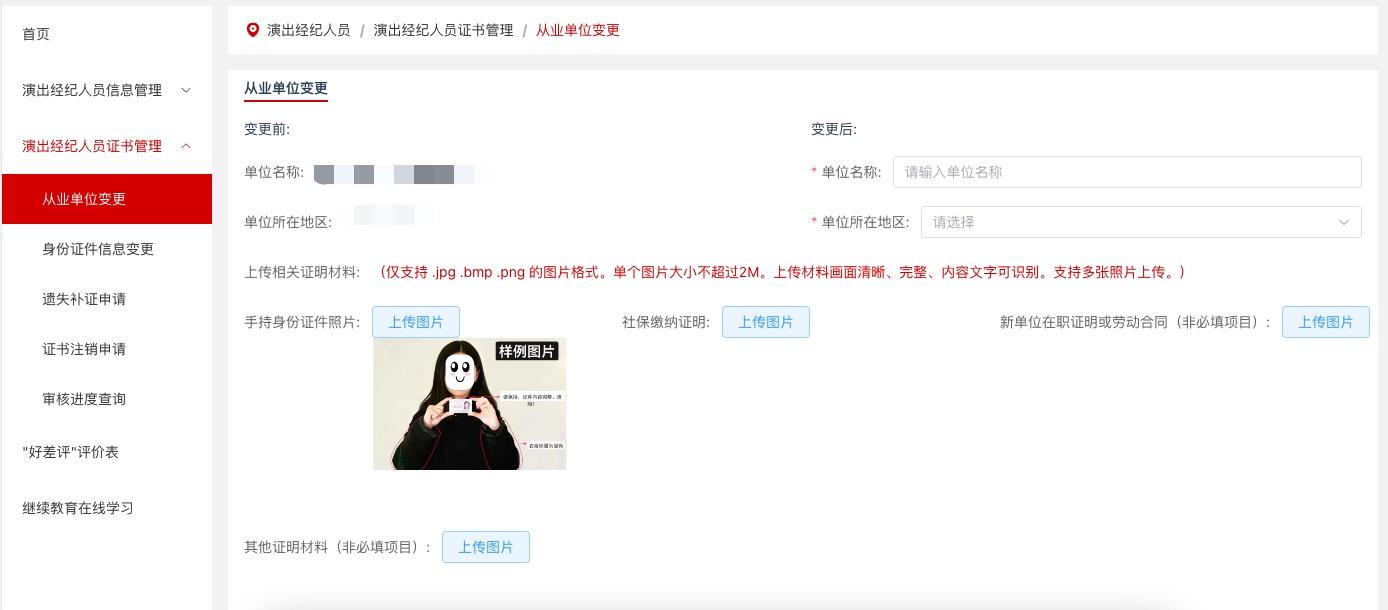 3.演出经纪人证书管理,选择从业单位变更,往下滑,填写要变更到的单位信息,上传经纪人手持身份证照片,和缴纳的社保证明,点击确认。
