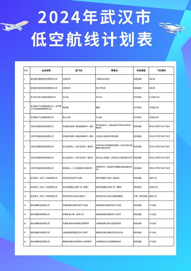 - 武汉 18 条试点航线:载人航线:汉南 — 十堰、汉南 — 荆州(老沙市机场)。物流航线:武商 Mall— 梦时代跨江商贸航线(全国首条)。